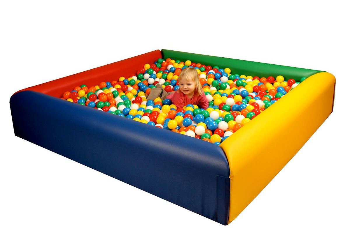 Dieses große Bällebad besteht aus 5 Teilen: 4 Seitenelemente (rot, grün, gelb und blau) und 1 Bodenplane. Wir empfehlen 2500 Euro-Matic Bälle für dieses Bällebad.