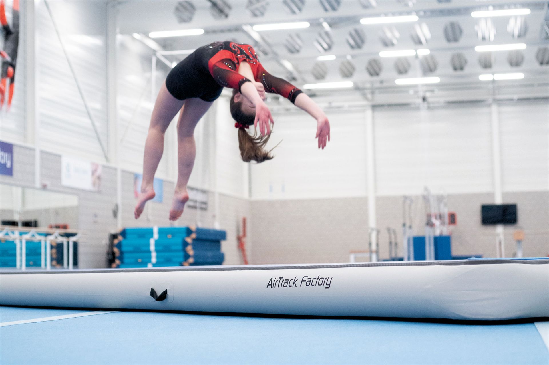 Die Befüllung der Air Track Matte erfolgt durch ein Gebläse, sodass die Bahn schnell auf- und abgebaut werden kann. So wird nur eine kleine Lagerfläche gebraucht. Durch die Menge an Luft, die eingelassen wird, kann der Härtegrad der Matte für verschiedene Übungen und Gewichtsklassen der Sportler angepasst werden.