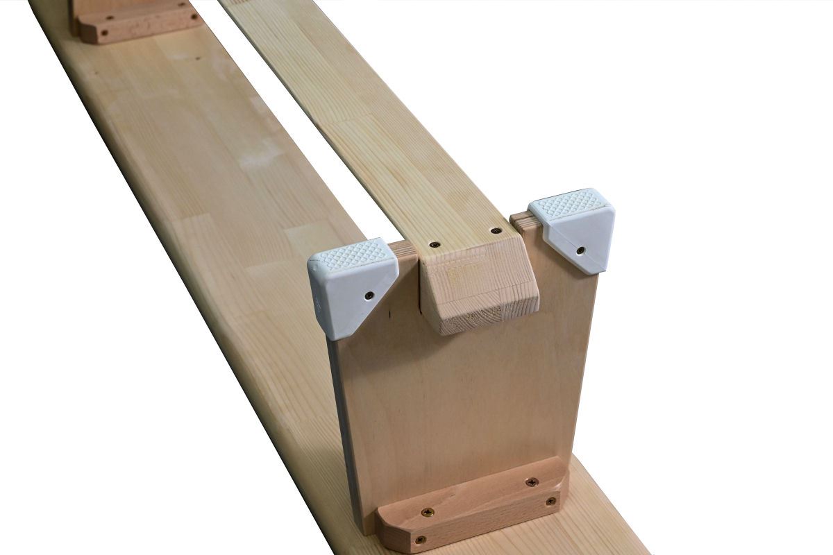 Besonders praktisch: Die integrierte Einhängeleiste macht die Turnbank vielseitig einsetzbar – ob an Holmen, Reckstangen, Sprungkästen oder (ab 2,5 m Länge) auch an Sprossenwänden.