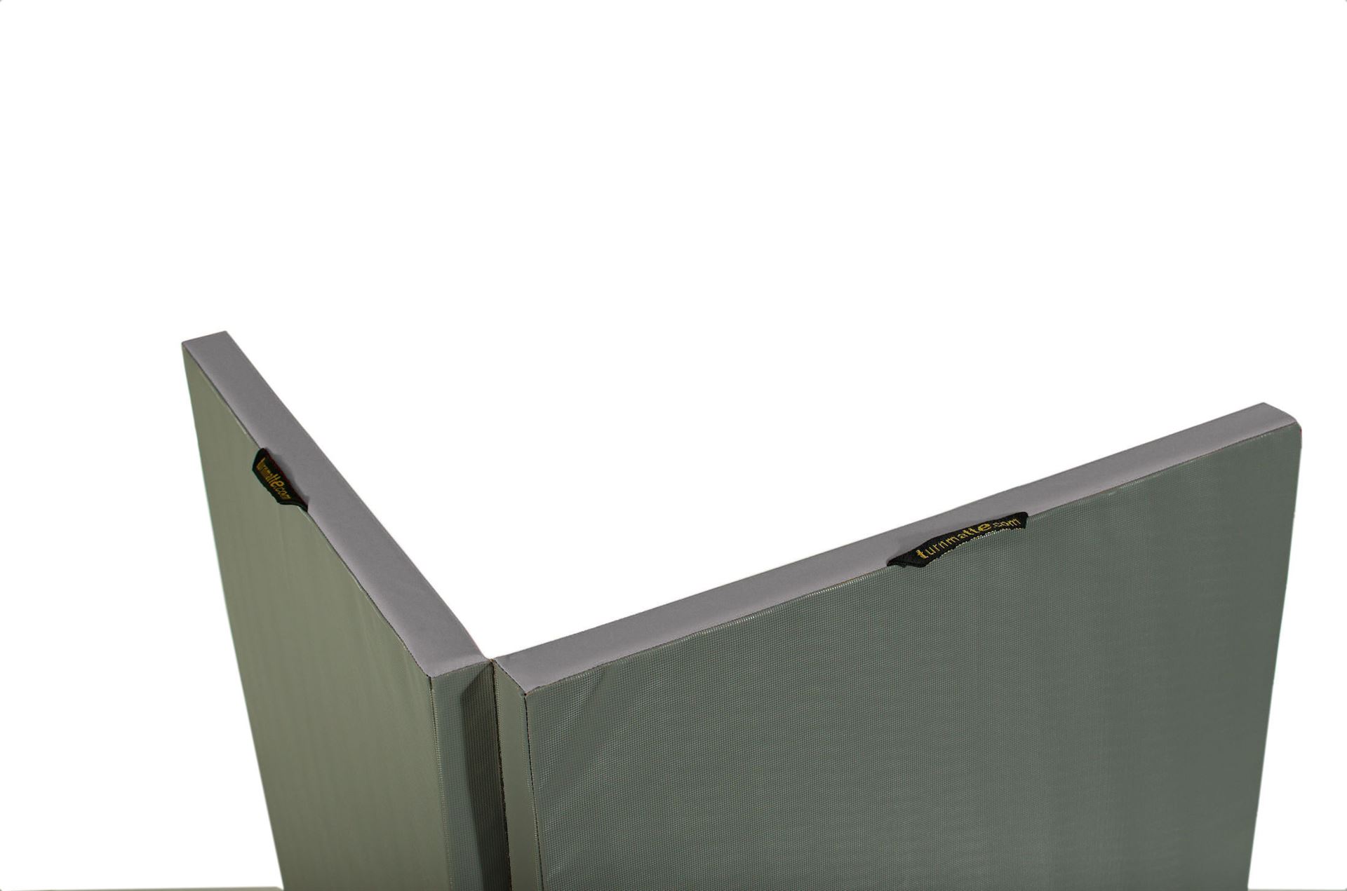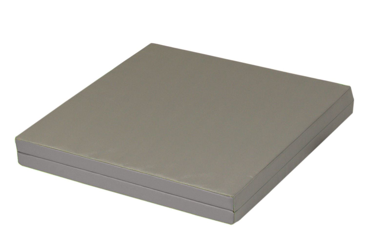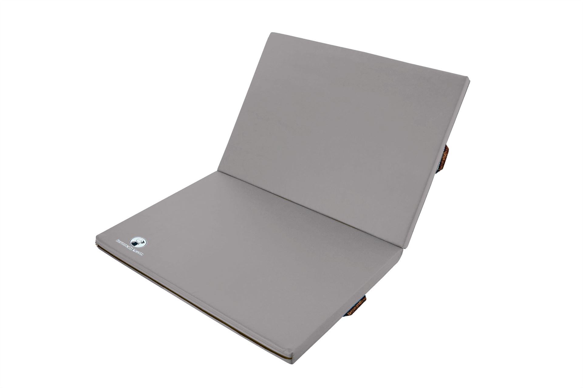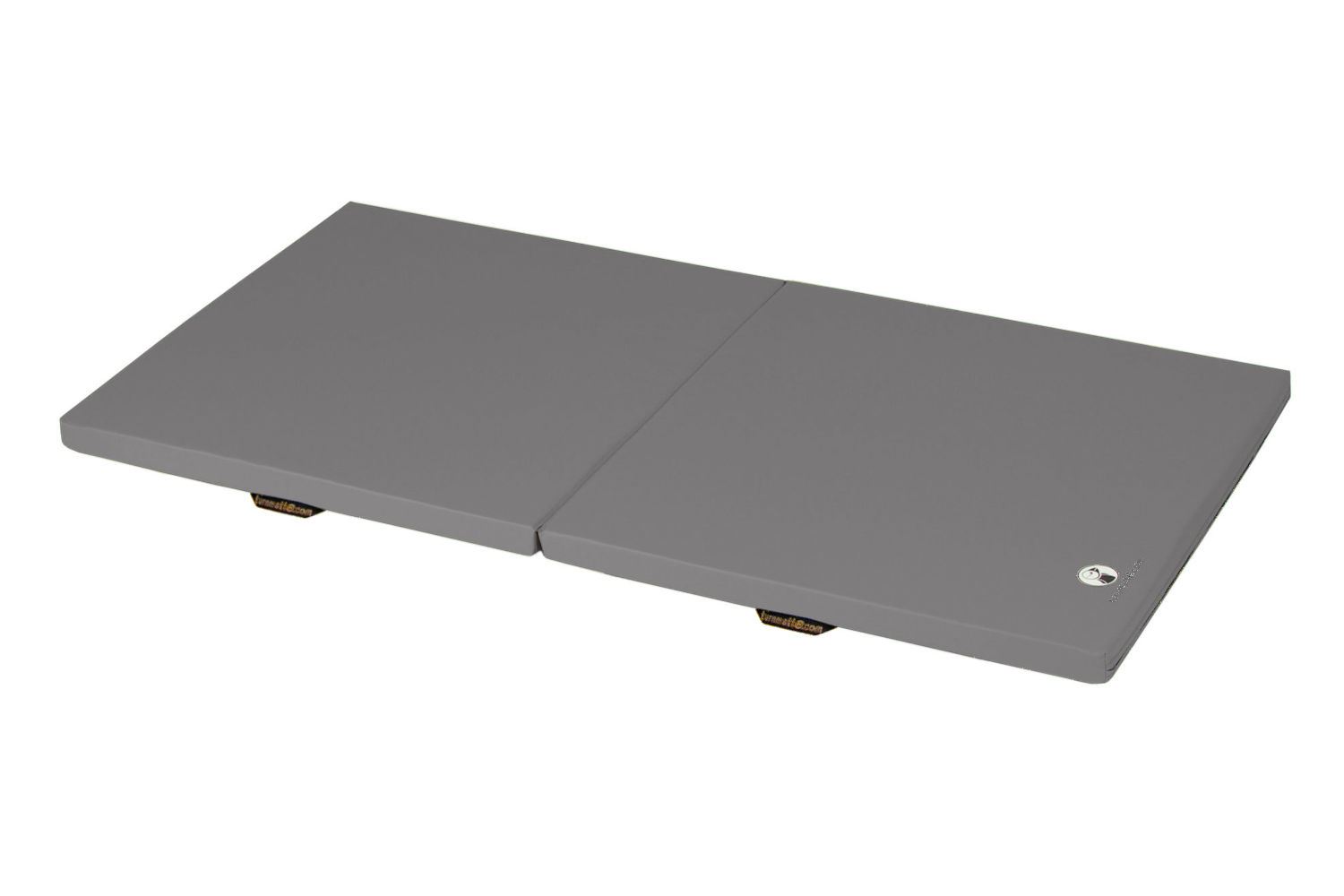 Diese klappbare Turnmatte ist besonders praktisch im häuslichen Bereich. Sie lässt sich platzsparend aufbewahren. Sie können die Klappmatte auch einfach ins Auto einpacken und auf Reisen oder ins Freie mitnehmen. Die Matte ist nach dem Einklappen nur noch 75 x 100 x 6 cm groß. Der Kern dieser 3 cm dicken Turnmatte in grau besteht aus Verbundschaum VB 100. Die Matte hat oben eine durchgehende Fläche ohne Spalt und unten einen Antirutschboden, der beim Zusammenklappen nach außen hin Schutz bietet.