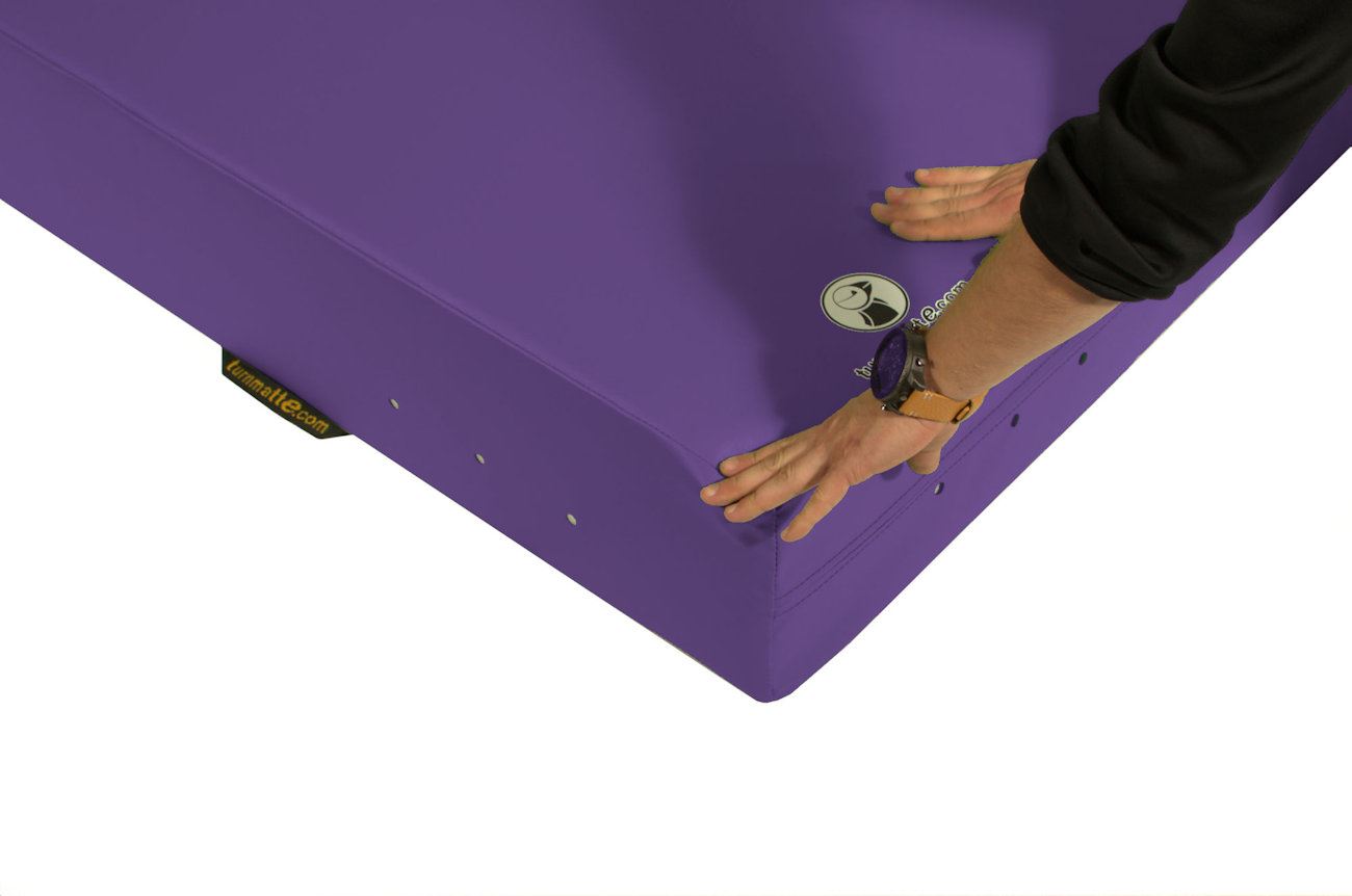 Die Bezüge werden aus robustem und hautfreundlichem Planenstoff gefertigt. Der Boden ist aus Antirutschmaterial für beste Rutschfestigkeit und noch mehr Sicherheit beim Turnen. Die Turnmatten – Bezüge sind angenehm strukturiert und einfach zu reinigen. Selbstverständlich sind die Bezüge frei von sämtlichen Arten von Weichmachern (also komplett phthalatfrei). Große Öffnungen an den Seiten des Bezugs erlauben der Luft bei Sprüngen auf die Matte schnell zu entweichen. Dadurch werden die Nähte geschont.